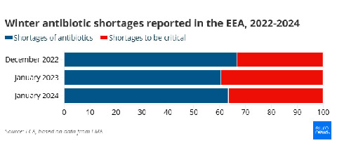 Τον Ιανουάριο του 2024, 19 χώρες του Ευρωπαϊκού Οικονομικού Χώρου (ΕΟΧ) αντιμετώπισαν ελλείψεις χειμερινών αντιβιοτικών, με 11 χώρες να καταγράφουν κρίσιμες ελλείψεις.