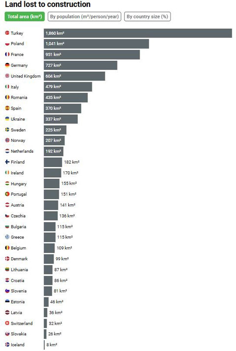 Η Τουρκία φαίνεται ότι είναι η «πρωτοπόρος» στην καταστροφή. Την υπό εξέταση περίοδο, κατέλαβε την υψηλότερη θέση για την ποσότητα πράσινης γης που χάθηκε μεταξύ 2018 και 2023. Έκανε κατασκευές σε 1.860 τετραγωνικά χιλιόμετρα φυσικής και καλλιεργήσιμης γης, ή το ένα πέμπτο του συνόλου στην Ευρώπη.