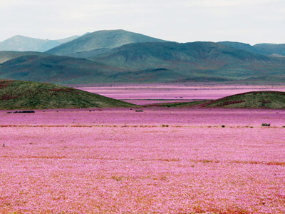 Εκατομμύρια λουλούδια ξεφύτρωσαν τις τελευταίες μέρες στη χιλιανή έρημο, η οποία εκτείνεται σε μήκος 1.600 χιλιομέτρων ανάμεσα στην οροσειρά των Ανδεων και τον Ειρηνικό Ωκεανό. Το σπάνιο φαινόμενο της «ανθισμένης ερήμου», ή «desierto florido» στα ισπανικά, συμβαίνει μόνο κάθε λίγα χρόνια, όταν ο χειμώνας του νοτίου ημισφαιρίου τύχει να φέρει αυγουστιάτικες βροχές.