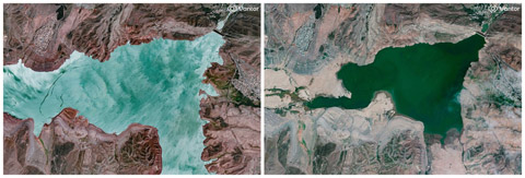 H στάθμη της τεχνητής λίμνης Σεφιντρούντ στο Ιράν τον Σεπτέμβριο του 2024 (Α) και τον Σεπτέμβριο του 2025 (Vantor via Reuters)