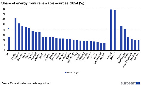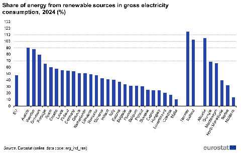 Οι χώρες της ΕΖΕΣ, η Νορβηγία και η Ισλανδία, καθώς και η υποψήφια χώρα Αλβανία, παρήγαγαν περισσότερη ηλεκτρική ενέργεια από ανανεώσιμες πηγές από τη συνολική ποσότητα ηλεκτρικής ενέργειας που κατανάλωσαν το 2024, με αποτέλεσμα το μερίδιό τους να υπερβαίνει το 100 %. Σε ορισμένες από αυτές τις περιπτώσεις, το αποτέλεσμα οφείλεται στην υψηλότερη παραγωγή σε σχέση με την κατανάλωση με καθαρές εξαγωγές (Νορβηγία) ή σε πραγματικό μερίδιο 100 %, αλλά η κανονικοποίηση της υδροηλεκτρικής ενέργειας ανεβάζει το αποτέλεσμα του μεριδίου σε υψηλότερο επίπεδο (Ισλανδία και Αλβανία).