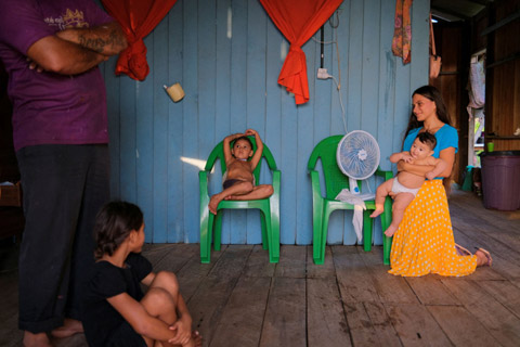 Η οικογένεια της Νιουμπιάν Φερέιρα Σάργες δροσίζεται με έναν ανεμιστήρια που λειτουργεί με φωτοβολταϊκά στη στέγη στο Μπρέβες της Βραζιλίας στις 28 Νοεμβρίου 2025 (Reuters)
