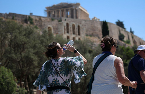 Μια γυναίκα πίνει νερό ενώ περπατά κοντά στην Ακρόπολη, καθώς μια καύσωνα πλήττει την Αθήνα, Ελλάδα, 8 Ιουλίου 2025. REUTERS/Louisa Gouliamaki